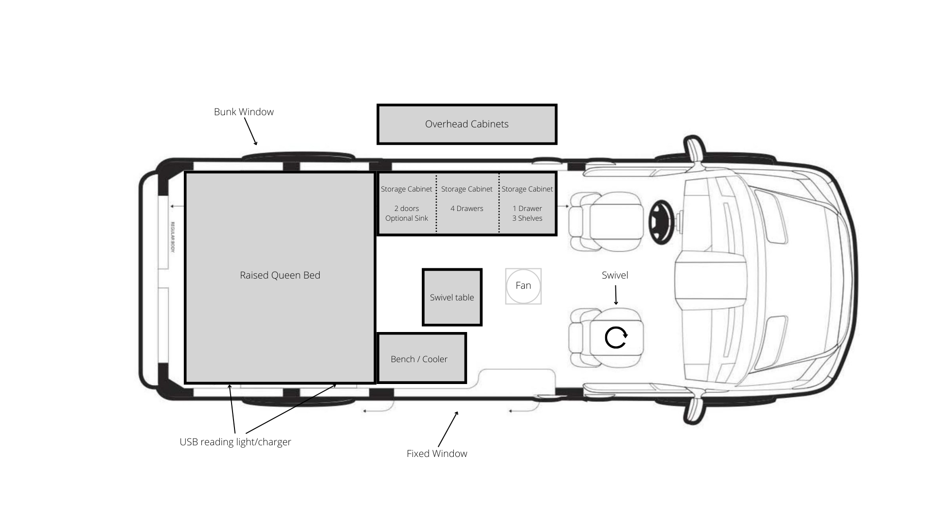 After you pay your 5% deposit, we will begin the design process. The day your van arrives, you will pay a 45% deposit, at which point we will begin the physical build.